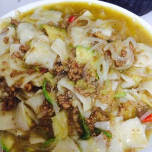 将备用的菜倒入,下好的面片中,搅匀,放入粉条和蒜末,OK好了,可以吃了