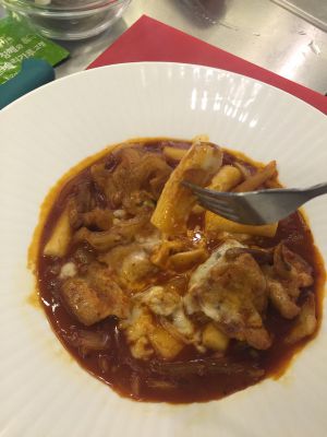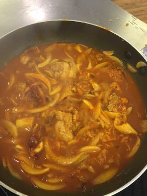 放入韩国辣酱再➕洋葱和蒜炒出香味,加入高汤。煮开锅。