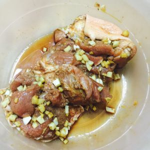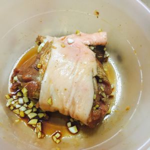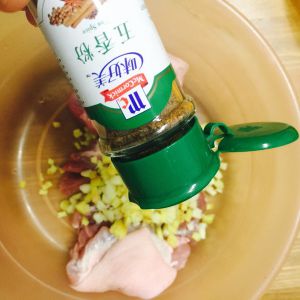 两片姜、两瓣蒜切末,放在猪蹄上面,撒上五香粉、孜然粉。