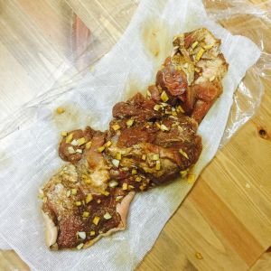把圆筒的猪肘剪开。