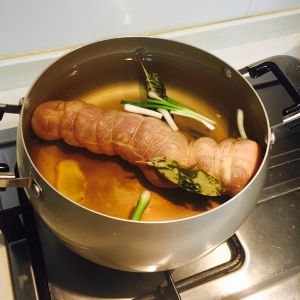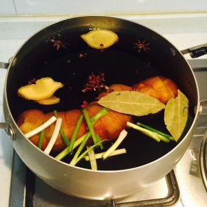 重新起锅,放入葱段、香叶两片、花椒、姜片四片、蒜瓣四个、老抽小半碗、料酒适量、盐一小勺,大火煮沸后转小火煮半小时关火,关火后闷半小时,再小火煮一小时。然后把锅子放凉,连锅一起放入冷藏让猪肘在卤料中泡一晚上。