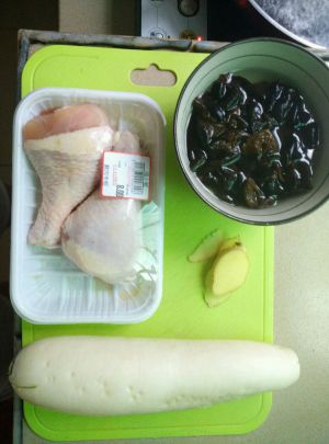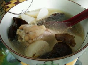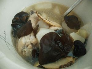 倒进炖汤锅里,放入白萝卜、木耳,按快炖键位。调键后调味:盐,鸡精。