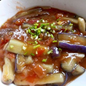 倒入茄子炒香,再加入小碗里的备用淀粉酱汁,烧熟起锅,装盘撒上葱花既可。
