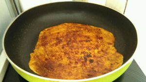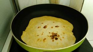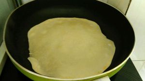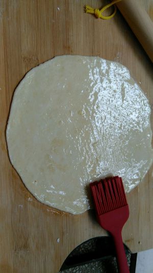 先在锅底刷一层油,再把饼放入,有油的那一面朝下,煎成像图片上的透明状即可翻面