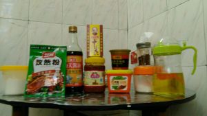 将甜面酱,豆瓣酱,蒜蓉辣酱,十三香,孜然,放入碗中搅拌均匀,三种酱按照1:1:1放入碗中,十三香和孜然粉按照自己的喜好放入,不要太多,会太干
