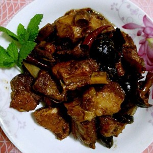 把排骨用水焯一下洗净扣水备用 葱切段 姜切片 蒜不用切开 扒皮后直接用,干辣椒切断 香菇用水焯一下切片备用。