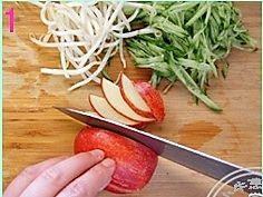 将黄瓜切成丝、绿豆芽摘去头尾、苹果切片、鸡蛋煮熟备用;