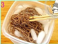 将煮好的荞麦面捞出,放在漏勺里用凉水冲掉泡沫面汤,然后浸泡在凉白开里(可加冰块);