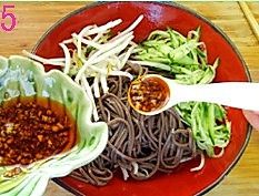 将荞麦面捞出稍稍控干水分,加黄瓜丝、绿豆芽、调味汁拌匀,上桌前加鸡蛋片、海苔、撒白芝麻即可。