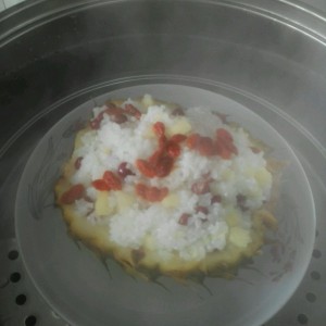 把糯米,红豆放入菠萝,最后放一点枸杞装饰。