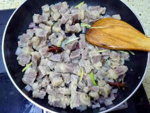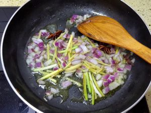 等油烧到5成热,加入洋葱、八角、姜丝炒香