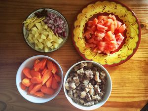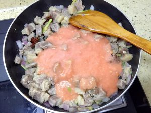 1、牛肉加入少许料酒过水,捞出沥干备用,2、土豆、胡萝卜、洋葱切成颗粒状备用,3、西红柿切十字刀过水剥皮,一半切成颗粒状、一半用榨汁机打成糊状。