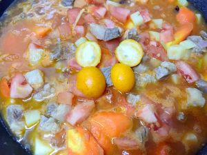 一次放入土豆、胡萝卜、金桔继续翻炒
