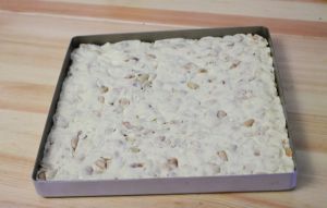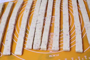 等彻底凉透后,盖上保鲜膜放置一晚,将做好的糖片倒扣在案板上,用刀切成1cm宽左右的长条
