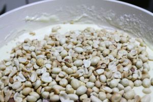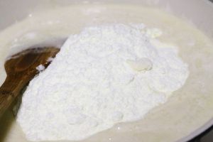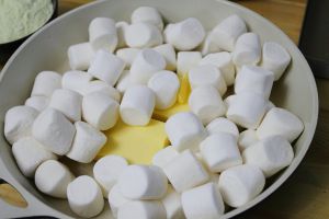 黄油、棉花糖放入不粘锅中,小火加热,加热的过程中用锅铲翻动