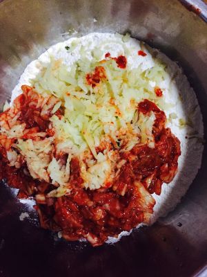 将面粉放在盆中,土豆擦丝,辣白菜剁碎放进盆中。