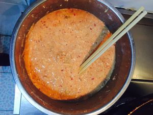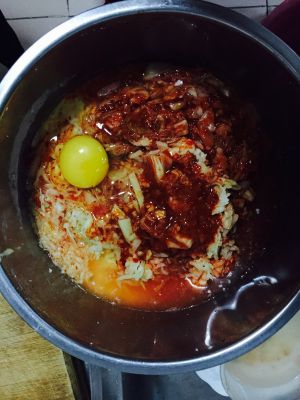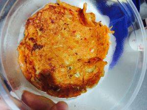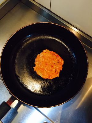 在锅中放入适量油,加入搅拌好的材料。摊成圆形。