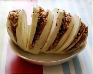 茄子切成4厘米厚度,然后中间再切一刀,但是不要切到底,方便放陷。