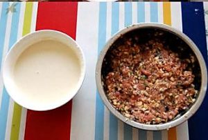面粉加水搅拌成糊糊状,把香菇末、葱姜蒜末加入肉馅里,然后加入盐、花生油、味极鲜、再加少许香油调拌均匀。