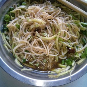 第三步 把焯好的金针菇放入小盆, 放入备好的,辣椒丝,葱花,盐,唐,醋,香油,麻油,辣椒油,用筷子拌匀即可。