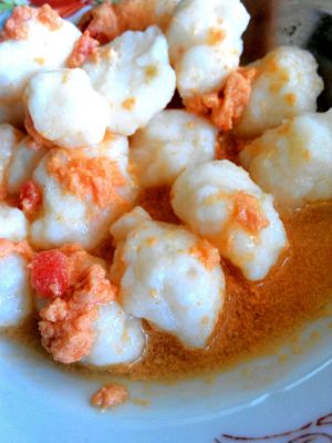 煮丸子。大火煮开,丸子全浮上来就熟了。熟了之后装盘。煮丸子的水倒掉一大半,把刚刚剥的虾子的黄放进去,加盐,迅速打散。加热至锅非常热,开始有点香味,汤汁变得有点少的时候起锅,浇到虾丸上。此菜没有半点腥味,全是虾的清鲜软嫩,而略有弹性的口感也很是吸引人。
