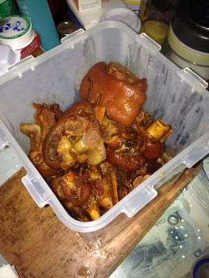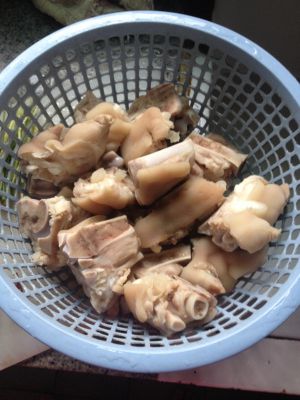 新鲜猪蹄买回家切小块拔毛,开水中汆一下 水中放点料酒和生姜片。水滚去沫之后放入冷水冲洗,这部一定不能省,这样的肉才会Q。