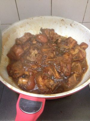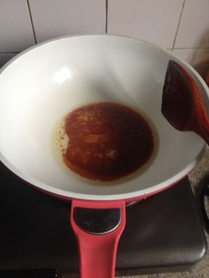 将冰糖融化至此状态,切不可操之过急,慢慢加温,用小火,不然会有焦味,对后面猪蹄入味也会有所影响。
