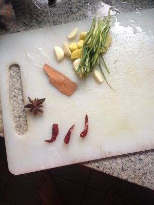 如图加入所有香料葱姜蒜,继续与猪蹄一起翻炒,此时会有香味飘出,闻到香味即可加水。
