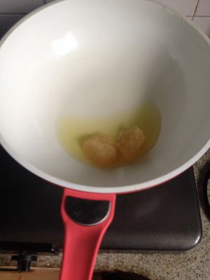 冷锅热油加入冰糖两大块,用油温将冰糖融化至焦糖状。我用的是太古黄冰糖,某宝大把,17元左右1kg。