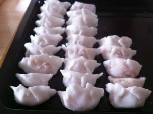 将拌好的虾馅和鲜虾包入,包成饺子(包的时候要注意,擀好的澄皮要用湿布盖好,不然会变硬)