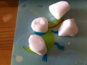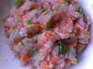将红萝卜、青皮豆切碎与虾泥一起均匀搅拌。