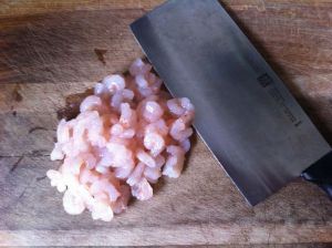将虾仁剁成虾泥。