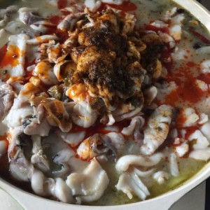 另外用盆倒入热水(有高汤最好),倒入备好的泡椒和泡椒水。
