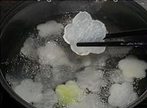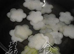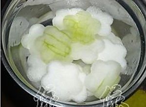 冬瓜削皮,切成0.5cm的片,用饼干模压出花形;