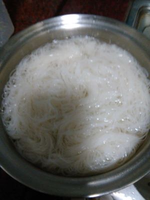 锅内下水,煮开后下米粉,下盐2茶匙,煮开约3分钟,过凉水待用