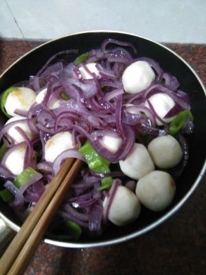 洋葱切丝,青椒切丝,鱼丸提前煮熟,起锅下洋葱炒,然后下青椒,一起炒至熟