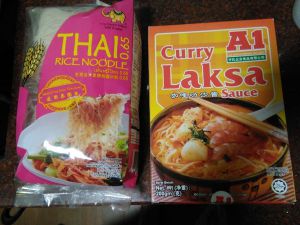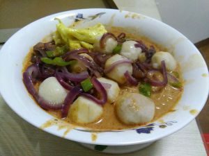 另一个锅煎好蛋饼卷起,把米粉下锅里和叻沙酱拌均匀,把做好的食材放在米分和汤料上,即可食用