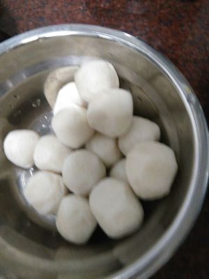 再把煮熟的鱼丸倒下去拌均匀,下一点盐调味