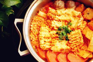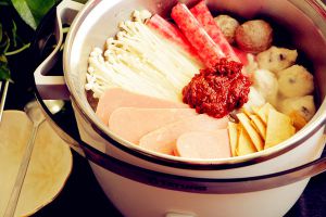 依次把鱼饼,金针菇,鱼丸等食材排在洋葱丝上面,并倒入牛骨汤, 放入调好的酱料,跟汤底充分混合,加热煮沸