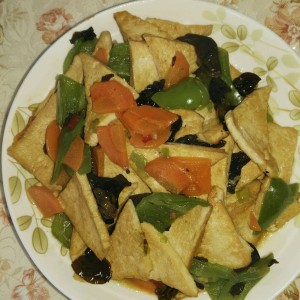 热油把豆瓣酱炒香,倒入青椒、胡萝卜、木耳翻炒