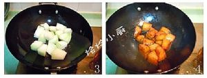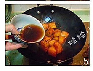 倒入冬瓜块,翻炒至稍变软。倒入酱油和老抽,继续翻炒。