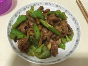 翻炒一下,倒入青椒,三分钟后起锅即可。因为肥肠和郫县豆瓣酱都有盐,所以炒制的时候不用再另外加盐,只需放点酱油即可。