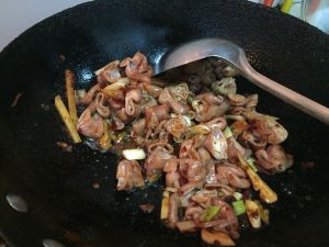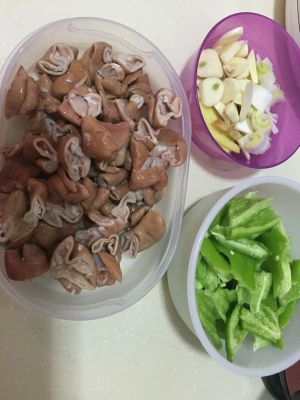 我买的是卤好的肥肠,将肥肠切小段,葱姜蒜切好,青椒用手掰成小块,这样更入味些。