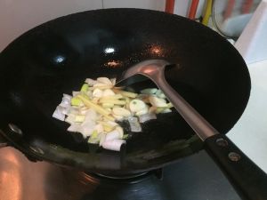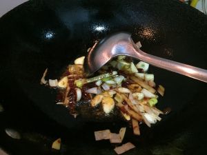 锅中油烧热,倒入葱姜蒜炒出香味,再倒入郫县豆瓣酱。