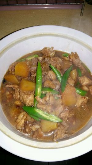 炖的差不多了放一汤勺蚝油,最好不要放鸡精,因为鸡很鲜了⊙﹏⊙把切好的尖椒放入,好了,我的南瓜炖鸡就做好了