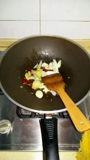 锅里放油烧热,放葱姜蒜和红辣椒,爆出香味。
