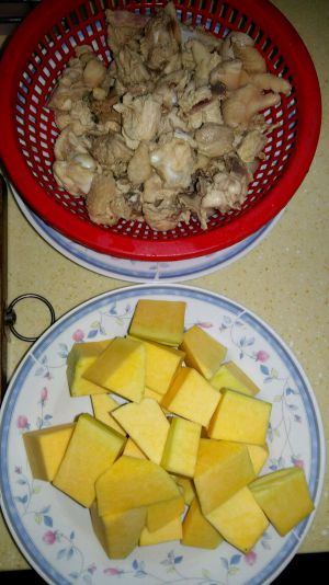 第二部,南瓜切滚刀块,鸡剁成小块飞水备用。