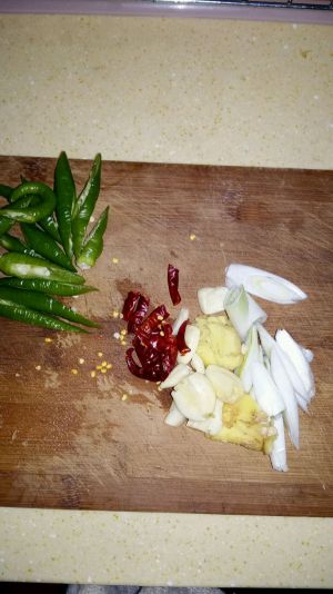 开始了,把葱,姜,蒜,红辣椒,青尖椒切好。
