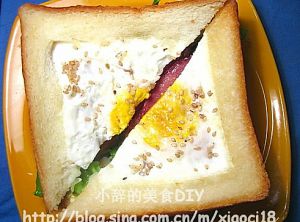 煎一分钟左右即可起锅(煎两片就OK了),,将一片面土司涂上沙拉酱,放上生菜叶,蕃茄,火腿,盖上一片煎好的土司,再涂沙拉酱,放菜叶,蕃茄,火腿。。。完成!