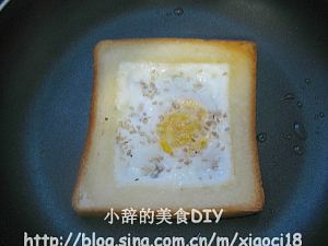 煎锅内放少许油,烧热后放入土司,将鸡蛋打入框内